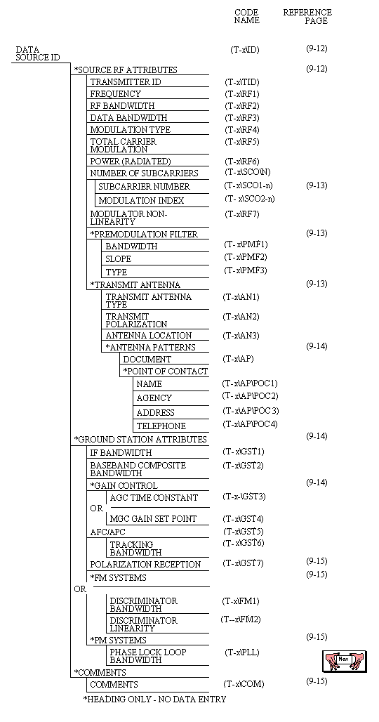 IRIG 106-99 CHAPTER 9 - TELEMETRY ATTRIBUTES TRANSFER STANDARD, Continued.... Start of Chapter 9 9.5.2 General Information (G) 9.5.4 Tape Source Attributes (R) 9.5.5 Multiplex/Modulation Attributes (M) 9.5.6.1 PCM Format Attributes (P) 9.5.6.2 PCM Measurement Description (D) 9.5.6.3 1553 Bus Data Attributes (B) 9.5.7 PAM Attributes (A) 9.5.8 Data Conversion Attributes (C) 9.5.9 Airborne Hardware Attributes (H) TELEMETRY ATTRIBUTES TRANSFER STANDARD, Continued.... 9.5.3 Transmission Attributes (T) 9.5.3 Transmission Attributes (T) The Transmission Attributes are presented graphically in figure 9-3 and specified in table 9-2. The information contained within this group is used to set up the RF receiver through the detection and recovery of the baseband composite waveform. The format contains the information needed to configure the antenna and receiver subsystems. Additional equipment inserted in a specific range configuration such as microwave or other relay is intended to be transparent to the user and is not described under Transmission Attributes. Because the information is mutually exclusive, only the appropriate frequency modulation (FM) or phase modulation (PM) system data set is required for a link. ![]() |