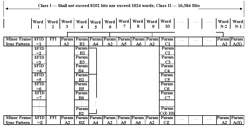 ![]() The Frame Format Identifier (Word 2) is shown in the preferred position as the first word following the ID counter. Parameters B1, B3, B4, B5, . . . , BZ, and C1, C2, C3, . . . , CZ are sampled once each Subframe, at 1/Z multipled by the Minor Frame rate. Parameter B2 is supercommutated on the Subframe and is sampled at less than the Minor Frame rate, but greater than the Subframe rate. |