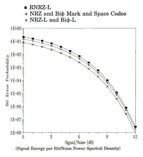 PCM STANDARDS ADDITIONAL INFORMATION AND RECOMMENDATIONS 1.0 Bit Rate Versus Receiver Intermediate-Frequency Bandwidth 2.0 Recommended PCM Synchronization Patterns 3.0 Spectral and BEP Comparisons 4.0 PCM Frame Structure Examples Footnotes 1.0 Bit Rate Versus Receiver Intermediate-Frequency Bandwidth The following subparagraphs contain information about selection of receiver intermediate-frequency (IF) bandwidths. Additional information is contained in RCC document 119, Telemetry Applications Handbook. 1.1 The standard receiver IF bandwidth values are listed in table 2-1. Not all bandwidths are available on all receivers or at all test ranges. Additional bandwidths may be available at some test ranges. The IF bandwidth, for data receivers, should typically be selected so that 90 to 99 percent of the transmitted power spectrum is within the receiver 3 dB bandwidth. 1.2 For reference purposes, in a well-designed PCM/FM system (NRZ-L data code) with peak deviation equal to 0.35 times the bit rate and an IF bandwidth (3 dB) equal to the bit rate, a receiver IF signal-to-noise ratio (SNR) of approximately 13 dB will result in a bit error probability (BEP) of 10 -6. A 1 dB change in this SNR will result in approximately an order of magnitude change in the BEP. The relationship between BEP and IF SNR in a bandwidth equal to the bit rate is illustrated in figure C-1 for IF bandwidths equal to the bit rate and 1.5 times the bit rate. An approximate expression for the BEP is ![]() Figure C-1. BEP versus IF SNR in bandwidth = bit rate for NRZ-L PCM/FM. where ![]() Other data codes and modulation techniques have different BEP versus SNR performance characteristics. 1.3 It is recommended that the maximum period between bit transitions be 64-bit intervals to ensure adequate bit synchronization. Table C-1 contains recommended frame synchronization patterns for general use in PCM telemetry. 2.0 Recommended PCM Synchronization Patterns Table C-1 contains recommended frame synchronization patterns for general use in PCM telemetry. Patterns are shown in the preferred order of transmission with "111" being the first bit sequence transmitted. This order is independent of data being LSB or MSB aligned. The technique used in the determination of the patterns for lengths 16 through 30 was essentially that of the patterns of 2n binary patterns off a given length, n, for that pattern with the smallest total probability of false synchronization over the entire pattern overlap portion of the ground station frame synchronization 15. The patterns for lengths 31 through 33 were obtained from a second source 16. 3.0 Spectral and BEP Comparisons for NRZ and Bi Figure C-2 shows the power spectral densities of baseband NRZ and Bi ![]() ![]() ![]() 4.0 PCM Frame Structure Examples Figures C-4, C-5, and C-6 show examples of allowable PCM frame structures. In each example, the Minor Frame Sync Pattern is counted as one word in the minor frame. The first word after the Minor Frame Sync Pattern is word 1. Figures C-5 and C-6 show the preferred method of placing the subframe ID counter in the minor frame. The counter is placed before the parameters that are referenced to it. Major Frame Length is as follows: |