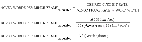5.8 CVSD Bit Rate Determination The following discussion provides a procedure for determining the CVSD bit rate based on the desired minimum CVSD bit rate and information given in the host PCM format. Note that this procedure assumes the CVSD words are inserted in a class I PCM format with constant word widths and are not subcommutated. The CVSD bit rate can be obtained by multiplying the minor frame rate by the number of times the CVSD words appear in the minor frame by the word width used for the CVSD words in the minor frame. This relationship is expressed in equation (5-1). (5-1) CVSD BIT RATE = MINOR FRAME RATE • #CVSD WORDS PER MINOR FRAME • WORD WIDTHKnowing the details on the host PCM format, equation (5-1) contains two unknowns: CVSD BIT RATE and #CVSD WORDS PER MINOR FRAME. One of these unknowns must be chosen by the user, then the other one can be calculated. The recommended procedure is to choose the desired (target value) CVSD bit rate and solve equation (5-1) for #CVSD WORDS PER MINOR FRAME. This relationship is expressed in equation (5-2). ![]() Next, round up (if required) the result of equation (5-2) to the nearest integer. To satisfy the evenly spaced recommendation, round up (if required) to the nearest integer that divides evenly into the number of PCM words per minor frame. Finally, for either case, substitute the result of equation (5-2) back into equation (5-1) to determine the actual CVSD bit rate. To illustrate this procedure, consider the following numerical example for determining the CVSD bit rate. An existing PCM format has the following characteristics: |