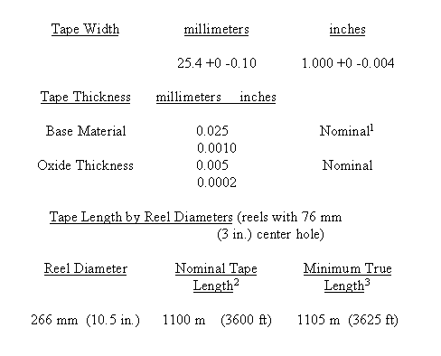 ![]() 1. Actual tape base material thickness slightly less because of manufacturing conventions. 2. Original dimensions are in feet. Metric conversions are rounded for convenience. 3. Tape-to-flange radial clearance (E-value) is 3.18 mm (0.125 in.). |