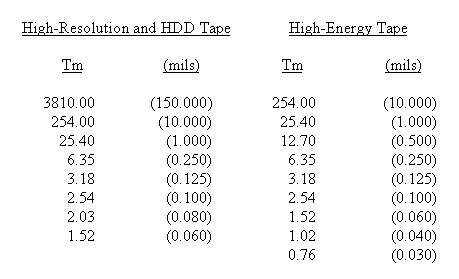 IRIG 106-99 CHAPTER 7 - MAGNETIC TAPE STANDARDS 7.1 General 7.2 Definitions 7.3 General Requirements for Standard Instrumentation Tapes and Reels 7.4 General Characteristics of Instrumentation Tapes and Reels 7.5 Physical Characteristics of Instrumentation Tapes and Reels 7.6 Instrumentation Tape Magnetic and Electrical Characteristics 7.7 General Requirements for 19-mm Digital Cassette Helical Scan Recording Tape and Cassettes 7.8 General Requirements for 1/2-Inch Digital Cassette Helical Scan Recording Tape and Cassettes Footnotes MAGNETIC TAPE STANDARDS 7.1 General These standards define terminology, establish key performance criteria, and reference test procedures for longitudinally-oriented oxide, unrecorded magnetic tape designed for instrumentation recording 1, and reference specifications for 19 mm (0.75 in) cassettes designed for digital helical scan recording and S-VHS cassettes designed for 12.65 mm (1/2 in) digital helical scan recording. Classes of instrumentation recording tapes include High Resolution (HR) tapes used for wide band recording, High Density Digital (HDD) tapes used for high density digital PCM recording, and High Energy (HE) tapes used for double density recording. Coercivities of HR and HDD tapes are in the range of 275 to 350 oersteds. High energy tapes have coercivities of 600 to 800 oersteds. Nominal base thickness is 25.4 Tm (1.0 mil) and nominal coating thickness is 5 Tm (200 microinches) for all tapes. Where required, limits are specified to standardize configurations and to establish the basic handling characteristics of the tape. Limits placed on the remaining requirements must be determined by the tape user in light of the intended application and interchangeability requirements imposed on the tape (see table 7-4 for examples of suggested requirement limits). 7.2 Definitions 7.2.1 Back Coating 7.2.2 Base 7.2.3 Bias Level 7.2.4 Bi-Directional 7.2.5 Binder 7.2.6 Blocking 7.2.7 Center Tracks 7.2.8 Dropout 7.2.9 Edge Tracks 7.2.10 Erasure 7.2.11 E-Value 7.2.12 High-Density Digital Magnetic Tape 7.2.13 High-Energy Magnetic Tape 7.2.14 High-Resolution Magnetic Tape 7.2.15 Layer-to-Layer Signal Transfer (Print Through) 7.2.16 Magnetic Oxide Coating 7.2.17 Manufacturer's Centerline Tape 7.2.18 Manufacturer's Secondary Centerline Tape 7.2.19 Modulation Noise 7.2.20 Record Level 7.2.21 Scatterwind 7.2.22 Shedding 7.2.23 Short Wavelength Output Uniformity 7.2.24 Upper Band Edge 7.2.25 Wavelength Response 7.2.26 Working Length 7.2.27 Working Reference Tape Underlined terms appearing within definitions indicate that these terms are defined elsewhere in paragraph 7.2. For the purpose of this standard, the following definitions apply. 7.2.1 Back Coating. A thin coating of conductive material (for example, carbon) bonded to the surface of a magnetic tape opposite the magnetic-coated surface for reducing electrostatic charge accumulation and for enhancing high-speed winding uniformity. Resistivity of the back coating should be 1 megohm per square or less, whereas the oxide-coated magnetic surface resistivity is much higher (also see magnetic oxide coating). 7.2.2 Base. The material on which the magnetic oxide coating (and back coating, if employed) is applied in the manufacture of magnetic tapes. For most applications, polyester-base materials are currently employed. 7.2.3 Bias Level. The level of high frequency ac bias current or voltage in a direct record system needed to produce a specified level of an upper band edge (UBE) frequency sine-wave signal at a particular tape speed. Usually adjusted to produce maximum output or increased beyond maximum to depress the output 2 dB. 7.2.4 Bi-Directional. Ability of a magnetic tape to record and to reproduce a specified range of signals within specified tolerances of various characteristics when either end of the tape on the reel is used as the leading end. 7.2.5 Binder. Material in which the magnetic oxide particles or back-coating particles are mixed to bond them to the base material. 7.2.6 Blocking. Failure of the magnetic coating to adhere to the base material because of layer-to-layer adhesion in a wound tape pack. 7.2.7 Center Tracks. On a recorded tape, center tracks are those which are more than one track distance from either edge of the tape, for example, tracks 2 through 13 of a 14-track tape or tracks 2 through 27 of a 28-track tape. 7.2.8 Dropout. A reproduced signal of abnormally low amplitude caused by tape imperfections severe enough to produce a data error. In digital systems, dropouts produce bit errors. 7.2.9 Edge Tracks. The data tracks nearest the two edges of a recorded magnetic tape, for example, tracks 1 and 14 of a 14-track tape. 7.2.10 Erasure. Removal of signals recorded on a magnetic tape to allow reuse of the tape or to prevent access to sensitive or classified data. Instrumentation recorders and reproducers do not usually have erase heads, so bulk erasers or degaussers must be employed. 7.2.11 E-Value. The radial distance by which the reel flanges extend beyond the outermost layer of tape wound on a reel under a tape tension of 3.33 to 5.56 newtons (12 to 20 ounces of force) per inch of tape width. Inadequate E-value may prohibit the use of protective reel bands. 7.2.12 High-Density Digital Magnetic Tape. Instrumentation magnetic tape with nominal base thickness of 25.40 Tm (1 mil) and coercivity of 275 to 350 oersteds used to record and reproduce high-density digital (PCM) signals with per-track bit densities of 590 b/mm (15 kb/in.) or greater. 7.2.13 High-Energy Magnetic Tape . Magnetic tapes having coercivity of 600 to 800 oersteds and nominal base thickness of 25.4 Tm (1 mil) used for double density analog recording and high-density digital recording above 980 b/mm (25 kb/in.). 7.2.14 High-Resolution Magnetic Tape. Instrumentation magnetic tape used for recording on wide band recorder and reproducer systems. The HR and HDD tapes may have identical coatings and coercivities (275 to 350 oers