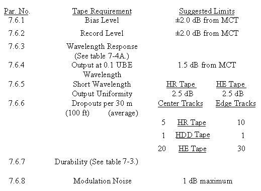 requirement. 7.6.8 Modulation Noise. The amplitude modulation superimposed upon a recorded and reproduced signal by the magnetic tape shall not exceed the limits specified by the tape user. The test procedure outlined in subparagraph 7.3.7, Modulation Noise, volume III of RCC document 118 shall be used to determine compliance with this requirement. 7.6.9 Layer-to-Layer Signal Transfer . A signal resulting from layer-to-layer signal transfer shall be reduced in amplitude from the original signal a minimum of 40 dB for 25.4 Tm (1.0 mil) tape and 46 dB for 38.1 Tm (1.5 mils) tape. The test procedure outlined in subparagraph 7.3.8, Layer-to-Layer Signal Transfer, volume III of RCC document 118 shall be used to determine compliance with this requirement. 7.6.10 Erasure Ease. For HR and HDDR tapes, an erase field of 79.58 kA/M (1000 oersteds) shall effect at least a 60 dB reduction in output amplitude of a previously recorded 25.4 Tm (1.0 mil) wavelength signal. For HE tapes, an erase field of 160 kA/m (2000 oersteds) shall effect at least a 60 dB reduction of a previously recorded 25.4 Tm (1.0 mil) wavelength signal. The test procedure outlined in subparagraph 7.3.9, Ease of Erasure, volume III of RCC document 118 shall be used to determine compliance with this requirement. 7.6.11 Suggested Tape Requirement Limits . Table 7-4 lists some suggested limits to be used for instrumentation tape. |