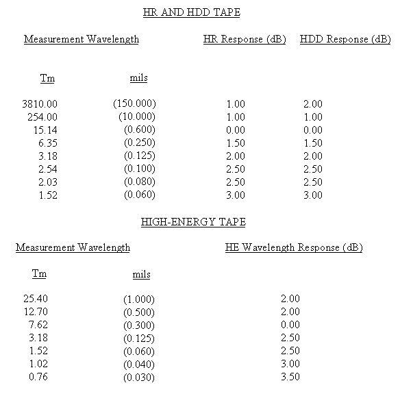 purchase. 7.5 Physical Characteristics of Instrumentation Tapes and Reels As specified in Federal Specification W-T-1553A and W-R-175. 7.6 Instrumentation Tape Magnetic and Electrical Characteristics 7.6.1 Bias Level 7.6.2 Record Level 7.6.3 Wavelength Response 7.6.4 Output at 0.1 UBE Wavelength 7.6.5 Short Wavelength Output Uniformity 7.6.6 Dropouts 7.6.7 Durability 7.6.8 Modulation Noise 7.6.9 Layer-to-Layer Signal Transfer 7.6.10 Erasure Ease 7.6.11 Suggested Tape Requirement Limits The following subparagraphs describe required magnetic and electrical tape characteristics. 7.6.1 Bias Level. The bias level (see subparagraph 7.2.3) required by the magnetic tape shall not differ from the bias level requirements of the reference tape by more than the amount specified by the tape user. The test procedure outlined in subparagraph 7.3.1, Bias Level, volume III of RCC document 118 shall be used to determine compliance with this requirement. 7.6.2 Record Level. The record level (see subparagraph 7.2.20) required by the magnetic tape shall not differ from the record level requirements of the reference tape by more than the amount specified by the tape user. The test procedure outlined in subparagraph 7.3.2, Record Level, volume III of RCC document 118 shall be used to determine compliance with this requirement. 7.6.3 Wavelength Response. The output of the magnetic tape, measured at the wavelength values listed in table 7-2, Measurement Wavelengths, shall not differ from the output of the reference tape by more than the amounts specified by the tape user. Wavelength response requirements shall be specified in terms of output after having normalized the output to zero decibels at the 0.1 UBE wavelength. The test procedure outlined in subparagraph 7.3.3, Wavelength Response and Output at 0.1 Upper Band Edge Wavelength, volume III of RCC document 118 shall be used to determine compliance with this requirement (see table 7-4A, Suggested Wavelength Response Requirements). |