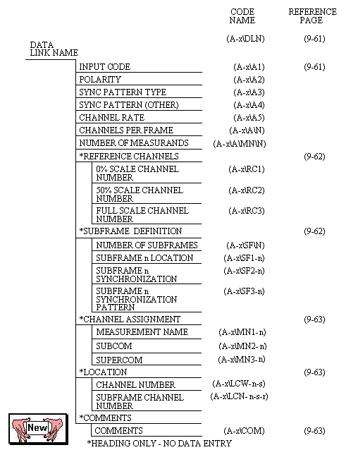 IRIG 106-99 CHAPTER 9 - TELEMETRY ATTRIBUTES TRANSFER STANDARD, Continued.... Start of Chapter 9 9.5.2 General Information (G) 9.5.3 Transmission Attributes (T) 9.5.4 Tape Source Attributes (R) 9.5.5 Multiplex/Modulation Attributes (M) 9.5.6.1 PCM Format Attributes (P) 9.5.6.2 PCM Measurement Description (D) 9.5.6.3 1553 Bus Data Attributes (B) 9.5.8 Data Conversion Attributes (C) 9.5.9 Airborne Hardware Attributes (H) TELEMETRY ATTRIBUTES TRANSFER STANDARD, Continued.... 9.5.7 PAM Attributes (A) 9.5.7 PAM Attributes (A). This group provides the information necessary to define the channelization and measurand definition for a PAM waveform. As with the PCM signal, the tie to the calibration data is with the measurement name. Figure 9-9 summarizes the types of inputs required. Table 9-8 specifies the details required. The information which defines the measurand for each channel is required for the channels of interest. ![]() |