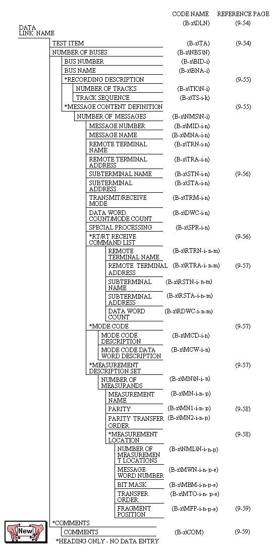 IRIG 106-99 CHAPTER 9 - TELEMETRY ATTRIBUTES TRANSFER STANDARD, Continued.... Start of Chapter 9 9.5.2 General Information (G) 9.5.3 Transmission Attributes (T) 9.5.4 Tape Source Attributes (R) 9.5.5 Multiplex/Modulation Attributes (M) 9.5.6.1 PCM Format Attributes (P) 9.5.6.2 PCM Measurement Description (D) 9.5.7 PAM Attributes (A) 9.5.8 Data Conversion Attributes (C) 9.5.9 Airborne Hardware Attributes (H) TELEMETRY ATTRIBUTES TRANSFER STANDARD, Continued.... 9.5.6.3 1553 Bus Data Attributes (B) 9.5.6.3 1553 Bus Data Attributes (B). Figure 9-8 and table 9-7 describes the 1553 bus-originated data formats. The 1553 Bus Data Attributes Group defines the attributes of a data acquisition system that is compliant with chapter 8. The primary components of this group are the recording description and message content definition. The former defines the method by which the data were recorded on the tape such as track spread versus composite. The latter consists of the message identification information and the measurement description set. The message identification information defines the contents of the control word that identifies each 1553 message. The measurement description set describes the measurement attributes and contains the measurement name which links the measurand to the Data Conversion Attributes Group (C). Mode codes are described in the message identification information. If the Subterminal Address (STA) field contains 00000 or 11111, the information in the Data Word Count/Mode Code field is a mode code and identifies the function of the mode code. If the mode code has associated data words, they are described in this section of the attributes. If the 1553 message is a remote terminal to remote terminal transfer, both the transmit command and the receive command are used to identify the message. ![]() |