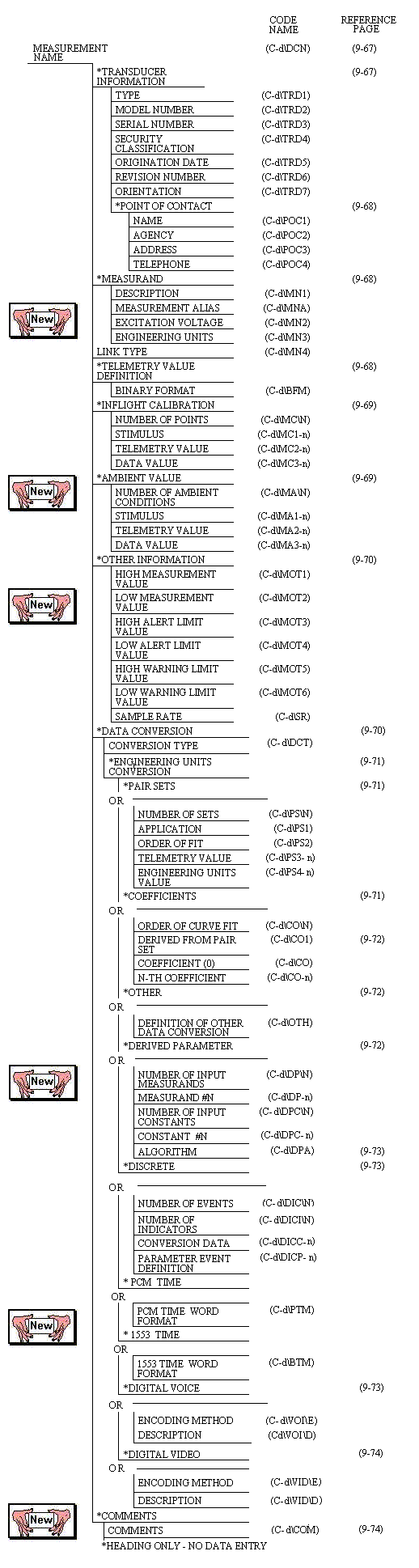IRIG 106-99 CHAPTER 9 - TELEMETRY ATTRIBUTES TRANSFER STANDARD, Continued.... Start of Chapter 9 9.5.2 General Information (G) 9.5.3 Transmission Attributes (T) 9.5.4 Tape Source Attributes (R) 9.5.5 Multiplex/Modulation Attributes (M) 9.5.6.1 PCM Format Attributes (P) 9.5.6.2 PCM Measurement Description (D) 9.5.6.3 1553 Bus Data Attributes (B) 9.5.7 PAM Attributes (A) 9.5.9 Airborne Hardware Attributes (H) TELEMETRY ATTRIBUTES TRANSFER STANDARD, Continued.... 9.5.8 Data Conversion Attributes (C) 9.5.8 Data Conversion Attributes (C). The Data Conversion Attributes Group includes a definition of the method by which the raw telemetry data is to be converted to meaningful information. The sensor calibration is contained in the group for each type of sensor which uses a standard calibration curve or for each sensor or parameter which has a unique calibration requirement. The calibration information can be entered in several different formats. Provision is made to permit a test organization to convert data set entries to coefficients of an appropriate curve fit and record the derived coefficients. Figure 9-10 shows the structure of the data conversion attributes. Table 9-9 contains the detailed information required. |
