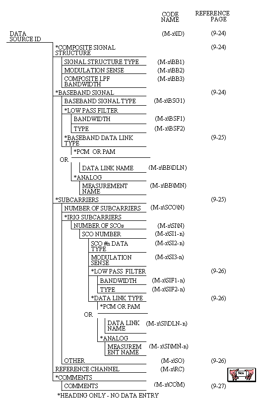 IRIG 106-99 CHAPTER 9 - TELEMETRY ATTRIBUTES TRANSFER STANDARD, Continued.... Start of Chapter 9 9.5.2 General Information (G) 9.5.3 Transmission Attributes (T) 9.5.4 Tape Source Attributes (R) 9.5.6.1 PCM Format Attributes (P) 9.5.6.2 PCM Measurement Description (D) 9.5.6.3 1553 Bus Data Attributes (B) 9.5.7 PAM Attributes (A) 9.5.8 Data Conversion Attributes (C) 9.5.9 Airborne Hardware Attributes (H) TELEMETRY ATTRIBUTES TRANSFER STANDARD, Continued.... 9.5.5 Multiplex/Modulation Attributes (M) 9.5.5 Multiplex/Modulation Attributes (M). The composite baseband waveform is received from the receiver or tape reproducer electronics and is passed to the demultiplexer/demodulator for further processing. Figure 9-5 summarizes the information that is required to continue processing the data. The composite baseband waveform may consist of any number of signals, which are modulated directly onto the RF carrier including a baseband data signal, and one or more subcarriers. The baseband data signal may be PCM, pulse amplitude modulation (PAM), or analog data. The PCM and PAM data streams must be defined in terms of a data link name. This data link name is unique for each system that contains different data, has a different format, or has a different data rate. The analog measurand is typically converted into engineering units appropriate for the measurand. The measurement name provides the connection to the Data Conversion Attributes Group (C). Subcarriers, both standard and nonstandard, may be part of the baseband composite waveform. These, in turn, may be modulated with PCM, PAM, or analog data. As with the baseband data signal, these data channels must be defined. Table 9-4 specifies the required information for the data signal attributes. ![]() |