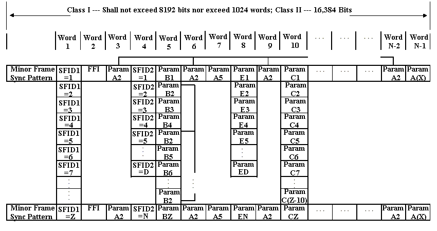 ![]() SFID1 and SFID2 are subframe counters. SFID1 has a depth Z<256; SFID2 has a depth D which is <Z. Z divided by D is not an integer. Location of the B and C parameters are given by the Minor Frame word number and the SFID1 counter. Location of the E parameters are given by the Minor Frame word number and the SFID2 counter. |
