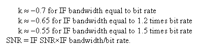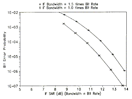PCM STANDARDS ADDITIONAL INFORMATION AND RECOMMENDATIONS 1.0 Bit Rate Versus Receiver Intermediate-Frequency Bandwidth 2.0 Recommended PCM Synchronization Patterns 3.0 Spectral and BEP Comparisons 4.0 PCM Frame Structure Examples Footnotes 1.0 Bit Rate Versus Receiver Intermediate-Frequency Bandwidth The following subparagraphs contain information about selection of receiver intermediate-frequency (IF) bandwidths. Additional information is contained in RCC document 119, Telemetry Applications Handbook. 1.1 The standard receiver IF bandwidth values are listed in table 2-1. Not all bandwidths are available on all receivers or at all test ranges. Additional bandwidths may be available at some test ranges. The IF bandwidth, for data receivers, should typically be selected so that 90 to 99 percent of the transmitted power spectrum is within the receiver 3 dB bandwidth. 1.2 For reference purposes, in a well-designed PCM/FM system (NRZ-L data code) with peak deviation equal to 0.35 times the bit rate and an IF bandwidth (3 dB) equal to the bit rate, a receiver IF signal-to-noise ratio (SNR) of approximately 13 dB will result in a bit error probability (BEP) of 10 -6. A 1 dB change in this SNR will result in approximately an order of magnitude change in the BEP. The relationship between BEP and IF SNR in a bandwidth equal to the bit rate is illustrated in figure C-1 for IF bandwidths equal to the bit rate and 1.5 times the bit rate. An approximate expression for the BEP is ![]() Figure C-1. BEP versus IF SNR in bandwidth = bit rate for NRZ-L PCM/FM. where ![]() Other data codes and modulation techniques have different BEP versus SNR performance characteristics. 1.3 It is recommended that the maximum period between bit transitions be 64-bit intervals to ensure adequate bit synchronization. Table C-1 contains recommended frame synchronization patterns for general use in PCM telemetry. 2.0 Recommended PCM Synchronization Patterns Table C-1 contains recommended frame synchronization patterns for general use in PCM telemetry. Patterns are shown in the preferred order of transmission with "111" being the first bit sequence transmitted. This order is independent of data being LSB or MSB aligned. The technique used in the determination of the patterns for lengths 16 through 30 was essentially that of the patterns of 2n binary patterns off a given length, n, for that pattern with the smallest total probability of false synchronization over the entire pattern overlap portion of the ground station frame synchronization 15. The patterns for lengths 31 through 33 were obtained from a second source 16. 3.0 Spectral and BEP Comparisons for NRZ and Bi Figure C-2 shows the power spectral densities of baseband NRZ and Bi ![]() ![]() ![]() 4.0 PCM Frame Structure Examples Figures C-4, C-5, and C-6 show examples of allowable PCM frame structures. In each example, the Minor Frame Sync Pattern is counted as one word in the minor frame. The first word after the Minor Frame Sync Pattern is word 1. Figures C-5 and C-6 show the preferred method of placing the subframe ID counter in the minor frame. The counter is placed before the parameters that are referenced to it. Major Frame Length is as follows: |