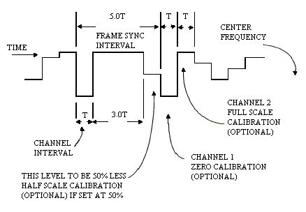 ![]() 2.1.2 In-Flight Calibration . It is recommended that in-flight calibration be used and channels 1 and 2, immediately following the frame synchroniza-tion interval, be used for zero and full-scale calibration. For RZ-PAM, channel 3 may be used for an optional half-scale calibration, and for NRZ-PAM, the channel interval preceding channel 1 may be used for half-scale calibration if set to 50 percent. 2.1.3 Frame Synchronization Interval . Each frame is identified by the presence within it of a synchronization interval. 2.1.3.1 Fifty Percent Duty Cycle (RZ-PAM) . The synchronization pattern interval shall have a duration equal to two information channel intervals (2T) and shall be full-scale amplitude for 1.5T followed by the reference level or zero baseline for 0.5T (see figure K-1). 2.1.3.2 One Hundred Percent Duty Cycle (NRZ-PAM). The synchronization pattern is in the order given: zero level for a period of T, full-scale amplitude for a period of 3T, and a level not exceeding 50-percent full-scale amplitude for a period T (see figure K-2). 2.1.4 Maximum Pulse Rate. The maximum pulse rate should not be greater than that permitted by the following subparagraphs. 2.1.4.1 PAM/FM/FM. The reciprocal of the shortest interval between transitions in the PAM pulse train shall not be greater than one-fifth of the total (peak-to-peak) deviation specified in chapter 3 and tables 3-1 and 3-2 for the FM subcarrier selected. 2.1.4.2 PAM/FM. The reciprocal of the shortest interval between transitions in the PAM pulse train shall be limited by whichever is the narrower of the following: 2.1.4.2.1 One-half of the 3 dB frequency of the premodulation filter when employed. 2.1.4.2.2 One-fifth of the intermediate frequency (IF) bandwidth (3 dB points) selected from the IF bandwidths which are listed in table 2-1. 2.2 Frame and Pulse Rate. The frame and pulse parameters listed below may be used in any combination: