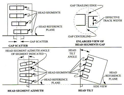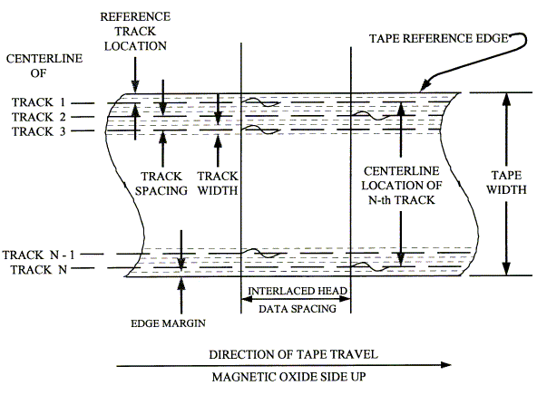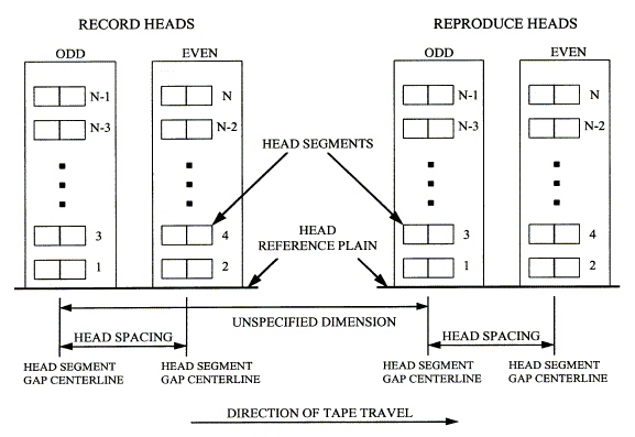 ![]() ![]() location (N-track interlaced system). ![]() ![]() 6.4.2 Track Numbering. The tracks on a tape are numbered consecutively from track 1 through track n with track 1 located nearest the tape reference edge as shown in figure 6-1. 6.4.3 Data Spacing. For interlaced formats, the spacing on tape between simultaneous events on odd and even tracks is nominally 38.1 mm (1.5 in.) (see paragraph 6.4.4.1). 6.4.4 Head Placement. The standard technique for wide band and 28-track double density is to interlace the heads, both the record and the reproduce, and to provide alternate tracks in separate heads. Thus, to record on all tracks of a standard width tape, two interlaced record heads are used; to reproduce all tracks of a standard width tape, two interlaced reproduce heads are used. For 14-track double density, the standard technique uses one in-line record head and one in-line reproduce head. 6.4.4.1 Head Placement, Interlaced. Two heads comprise the record-head pair or the reproduce-head pair. Mounting of either head pair is done in such a manner that the center lines drawn through the head gaps are parallel and spaced 38.10 mm ±0.05 (1.500 in. ±0.002) apart, as shown in tables 6-2 and 6-4, for systems that include head azimuth adjustment. The dimension between gap centerlines includes the maximum azimuth adjustment required to meet system performance requirements. For systems with fixed heads, that is, heads without an azimuth adjustment, the spacing between gap center lines shall be 38.10 mm ±0.03 (1.500 in. ±0.001) (see figure 6-2). 6.4.4.2 Head Identification and Location. A head segment is numbered to correspond to the track number that segment records or reproduces. Tracks 1, 3, 5, . . . are referred to as the "odd" head segments. Tracks 2, 4, 6, . . . are referred to as the even head segments. For interlaced heads, the head containing the odd numbered segments (odd head) is the first head in a pair.of heads (record or reproduce) over which an element of tape passes when moving in the forward record or reproduce direction (see figure 6-2). 6.4.4.3 In-Line Head Placement. An in-line head shall occupy the position of head number 1 in an interlaced system. 6.4.4.4 Head Segment Location. Any head segment within a head shall be located within ±0.05 mm (±0.002 in.) of the nominal (dimension from table without tolerances) position required to match the track location as shown in figure 6-1 and tables 6-2 through 6-4. |