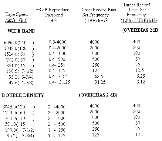 the upper band edge frequency (0.1 UBE) 2 When setting record bias level, a UBE frequency input signal is employed. The signal input level is set 5 to 6 dB below standard record level to avoid saturation effects which could result in erroneous bias level settings. The record bias current is adjusted for maximum reproduce output level and then increased until the output level decreases by the number of dB indicated in the table (see paragraph 4.1.3.3 of volume III,RCC document 118). |