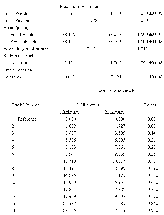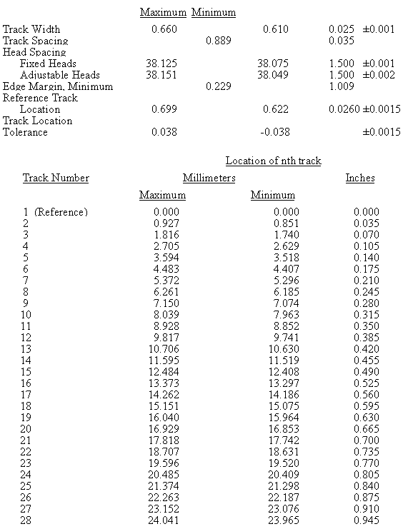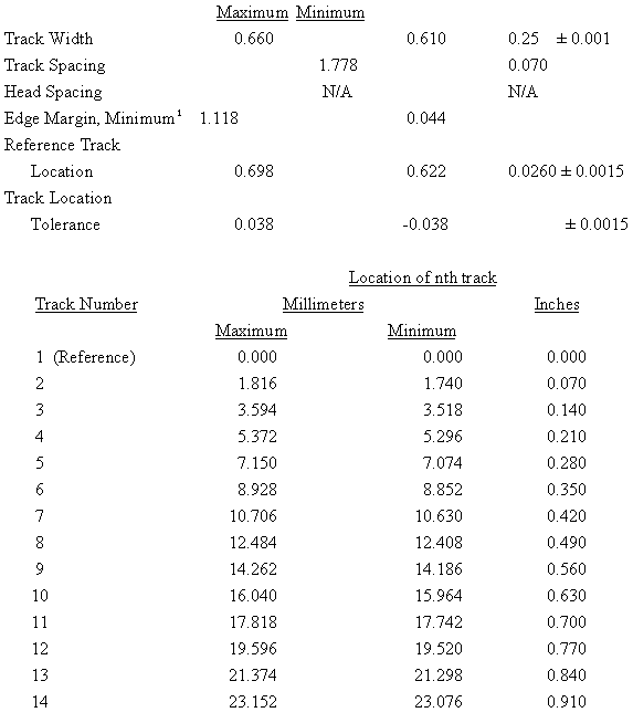 | 1 Track location and spacing are the same as the odd tracks of the 28-track interlaced format (see table 6-4). Edge margin for track 1 is only 0.229 mm (0.009 in.). |