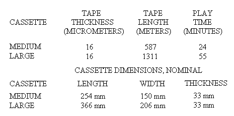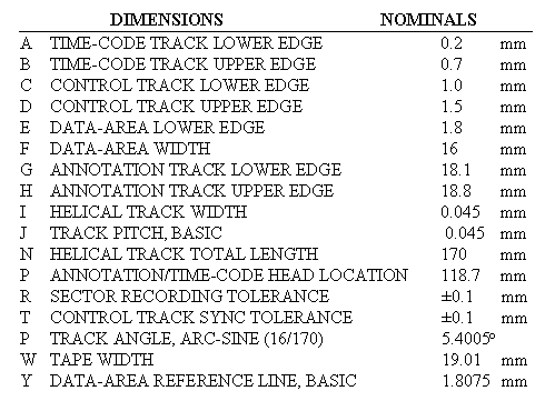 6.12 Preamble Recording for Automatic or Manual Recorder Alignment 6.12.1 Alignment, Direct Electronics 6.12.2 Alignment, FM Electronics A preamble (or postamble) may be recorded on the same tape as the data signal with known frequency and amplitude elements which will allow automatic or manual alignment of the signal electronics to optimize the performance of the playback system. Reproduce azimuth, equalization, and FM demodulator sensitivity may be adjusted at all available tape speeds. The preamble may be used for manual adjustment of any instrumentation magnetic tape recorder/reproducer (wide band and double density). Automatic adjustment requires a recorder/reproducer specifically designed with the capability to automatically adjust one or more of the following: reproduce-head azimuth, amplitude equalization, phase equalization, and FM demodulator sensitivity. The signal source may be internal to the recorder or may be externally generated. 6.12.1 Alignment, Direct Electronics. Direct electronics shall use a 1/11 band edge square wave for both manual and automatic alignment as given in appendix D. 6.12.2 Alignment, FM Electronics. The FM electronics shall use a 1/11 band edge square wave and ±1.414 Vdc or 0.05 Hz square wave for both manual and automatic alignment as given in appendix D. 6.13 19-mm Digital Cassette Helical Scan Recording Standards 6.13.1 Track Format 6.13.2 Tape and Cassettes 6.13.3 Recorder/Reproducer Input and Output These standards are for single-channel high-bit rate helical scan digital recorders using 19 mm tape cassettes. Bit rates of less than 10 megabits per second to 256 megabits per second or greater may be recorded and reproduced by equipment conforming to these standards. Interchange parties must, however, determine the availability at a particular site of the equipment required to meet particular data recording requirements. Compatibility between the recording device and the expected playback equipment must also be considered. 6.13.1 Track Format. The format recorded and reproduced by these systems shall be as specified in American National Standard For Information Systems 19-mm Type ID-1 Recorded Instrumentation Digital Tape Format, ANSI X3.175-19902 . Helical tracks employ azimuth recording wherein the head gap angle with respect to the recorded track center line is 90° + 15° for one scan and 90° - 15° for the adjacent scan. (See subparagraph 4.9.2 of standard X3.175-1990). Figure 6-6 and table 6-10 show details of the helical tracks and auxiliary longitudinal tracks for control, timing, and annotation in the ID-1 format. 6.13.2 Tape and Cassettes. Magnetic tape and 19-mm cassettes are specified in chapter 7. The magnetic tape shall meet the requirements for 850 oersted class (68,000 A/M). A tape base thickness of 16 um is normally employed. The recorder/reproducers shall be capable of using 19-mm cassettes that conform to the physical dimensions of medium and large cassettes as shown in table 6-11. Table 6-11 shows tape capacities and indicates the amount of time available for recording, assuming a data input rate of 240 megabits per second. 6.13.3 Recorder/Reproducer Input and Output. Data input and clock are required. The data input shall be in an 8-bit parallel, byte serial format, and the clock signal will be at the required byte rate. Data output will also be in 8-bit parallel format. ![]()