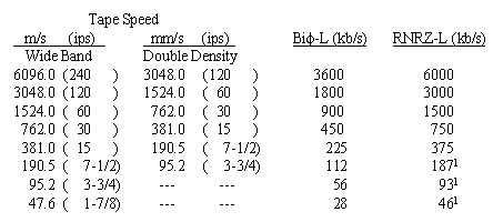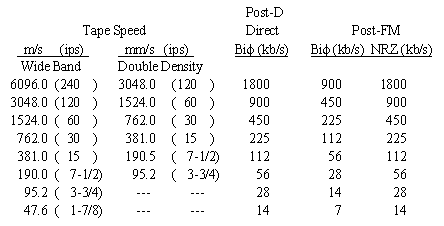 6.10.4 Speed Control and Compensation. Subparagraph 6.8.4 shall apply. Note that a separate track is always required for speed control and flutter compensation signals with a single-carrier FM system. 6.10.5 FM Record Parameters. For FM record systems, an input voltage of 1 to 10 V peak-to-peak shall be adjustable to produce full frequency deviation. 6.10.5.1 Deviation Direction. Increasing positive voltage gives increasing frequency. Predetection recorded tapes may be recorded with reverse deviation direction because of the frequency translation techniques employed. 6.10.6 FM Reproduce Systems. Output levels are for signals recorded at full deviation. In wide band and double density FM systems, the output is 2 V peak-to-peak minimum across a load impedance of 75 ohms ±10 percent. Increasing input frequency gives a positive going output voltage. 6.11 PCM Recording 6.11.1 Predetection PCM Recording 6.11.2 Post-Detection PCM Recording 6.11.3 Serial High-Density Digital Recording 6.11.4.1 PCM Codes 6.11.4.2 Bi 6.11.4.3 RNRZ-L Code 6.11.4.4 Record Parameters 6.11.4.5 Reproduce Parameters 6.11.4.5.1 PCM Signature 6.11.4.5.2 Phase Equalizer 6.11.4.6 Magnetic Tape 6.11.4.7 Tape Copying 6.11.4.8 PCM Bit Synchronizer The PCM signals may be successfully recorded using several different methods. Methods included in these standards are predetection recording, post-detection recording, and serial high-density digital recording (HDDR). Parallel HDDR methods are not included. 6.11.1 Predetection PCM Recording. This method employs direct recording of the signal obtained by heterodyning the receiver IF signal to one of the center frequencies listed in table 6-6 without demodulating the serial PCM signal (see figure 6-4). The maximum recommended bit rate for predetection recording of NRZ data is equal to the predetection carrier frequency, for example, 900 kb/s for a 900 kHz predetection carrier. The maximum recommended bit rate for predetection recording of bi-phase (Bi 6.11.2 Post-Detection PCM Recording. The serial PCM signal (plus noise) at the video output of the receiver demodulator is recorded by direct or wide band FM recording methods without first converting the PCM signal to bi-level form (see figure 6-4). Table 6-8 lists maximum bit rates versus tape speed for these recording methods. The minimum recommended reproduce bit rates are 10 kb/s for post-detection direct Bi