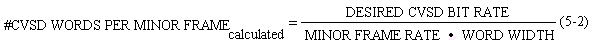 5.8 CVSD Bit Rate Determination The following discussion provides a procedure for determining the CVSD bit rate based on the desired minimum CVSD bit rate and information given in the host PCM format. Note that this procedure assumes the CVSD words are inserted in a class I PCM format with constant word widths and are not subcommutated. The CVSD bit rate can be obtained by multiplying the minor frame rate by the number of times the CVSD words appear in the minor frame by the word width used for the CVSD words in the minor frame. This relationship is expressed in equation (5-1). (5-1) CVSD BIT RATE = MINOR FRAME RATE • #CVSD WORDS PER MINOR FRAME • WORD WIDTHKnowing the details on the host PCM format, equation (5-1) contains two unknowns: CVSD BIT RATE and #CVSD WORDS PER MINOR FRAME. One of these unknowns must be chosen by the user, then the other one can be calculated. The recommended procedure is to choose the desired (target value) CVSD bit rate and solve equation (5-1) for #CVSD WORDS PER MINOR FRAME. This relationship is expressed in equation (5-2). ![]() Next, round up (if required) the result of equation (5-2) to the nearest integer. To satisfy the evenly spaced recommendation, round up (if required) to the nearest integer that divides evenly into the number of PCM words per minor frame. Finally, for either case, substitute the result of equation (5-2) back into equation (5-1) to determine the actual CVSD bit rate. To illustrate this procedure, consider the following numerical example for determining the CVSD bit rate. An existing PCM format has the following characteristics: |