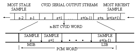 5.7 CVSD Word Sample Rate The CVSD word sample rate is dependent on the minimum desired CVSD bit rate, the PCM word length, and the PCM word sample rate. Once the CVSD word sample rate is determined, the actual CVSD bit rate can be calculated. The decoder must be run at the same CVSD bit rate as the encoder. |