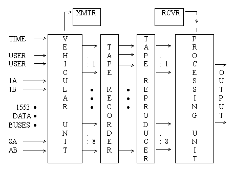IRIG 106-99 CHAPTER 8 - MIL-STD-1553 ACQUISITION FORMATTING STANDARD 8.1 General 8.2 Definitions 8.3 Source Signal 8.4 Word Structure 8.5 Time Words 8.6 Composite Output 8.7 Single Bus Track Spread Recording Format MIL-STD-1553 ACQUISITION FORMATTING STANDARD 8.1 General This standard addresses the acquisition of all the traffic flowing on MIL-STD-1553 type data buses. The formats described permit up to eight data buses within a single system. Other constraints such as RF bandwidth and tape recording time will dictate the actual number of buses processed by a single system. Standards for both composite (telemetry) and tape recorder formats are presented. Although specifically designed to satisfy the requirements of 100 percent MIL-STD-1553 bus acquisition, the formatting provisions of this standard may be used in other applications when the data source and content are similar enough to permit easy adaptation. Users should contact the appropriate range to ensure any adaptations are compatible with that range. 8.2 Definitions 8.2.1 Bus Monitor 8.2.2 Data Bus 8.2.3 Dual Redundant Data Bus 8.2.4 Bus Loading 8.2.5 Maximum Burst Length 8.2.6 Bus Error 8.2.1 Bus Monitor. The terminal assigned the task of receiving bus traffic and extracting all information to be used at a later time. 8.2.2 Data Bus. All hardware including twisted shielded pair cables, isolation resistors, and transformers required to provide a single data path between the bus controller and all the associated remote terminals. 8.2.3 Dual Redundant Data Bus . The use of two data buses to provide multiple paths between the subsystems. 8.2.4 Bus Loading. The percentage of time the data bus is active. 8.2.5 Maximum Burst Length. The maximum length of a continuous burst of messages with minimum length message gaps. 8.2.6 Bus Error. Conditions detected which violate the definition of MIL-STD-1553 word structure. Conditions such as synchronization, Manchester, parity, noncontiguous data word, and bit count/word errors are all considered word type errors. System protocol errors, for example, incorrect word count/message and illegal mode codes, are not considered bus errors. 8.3 Source Signal The source of data is a signal conforming to MIL-STD-1553. Format provisions are made for a dual redundant data bus system per bus. The interface device performing the data acquisition shall be configured as a bus monitor. Figure 8-1 depicts in block diagram form the concept of 100 percent MIL-STD-1553 bus data acquisition. ![]() |