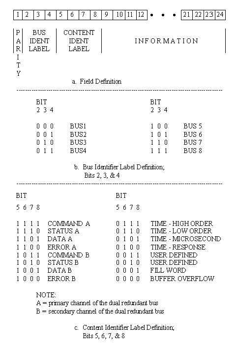 8.4 Word Structure The following subparagraphs describe the general word structure to be used for the formatted output. 8.4.1 The formatted data shall be a 24-bit word constructed as shown in figure 8-2(a). ![]() 8.4.2 The information extracted from the data bus shall have the synchronization pattern and parity bit removed. 8.4.3 Each incoming MIL-STD-1553 word (Command, Status or Data), auxiliary input or time word shall be appropriately labeled with a 4-bit content identifier label as described in figure 8-2(c). 8.4.4 Data extracted from the MIL-STD-1553 bus shall maintain bit order integrity in the information field for a command, status, data, and error word. Bit position four in the MIL-STD-1553 bus word shall be placed in bit position nine in the formatted data word. The remaining bits of the MIL-STD-1553 bus word shall be placed in successive bit positions in the formatted data word. Transposing or reordering of the bits is not permitted. 8.4.5 Each word shall also carry a 3-bit bus identifier label as shown in figure 8-2(b). 8.4.6 An odd-parity bit generated for the resulting formatted data shall be the most significant bit as shown in figure 8-2(a). 8.4.7 Fill words, required to maintain continuous data output, shall have 1010 1010 1010 1010 (AAAA hex) as the information bit pattern. 8.4.8 For bus errors defined in paragraph 8.2.6 (Error A - 1100 or Error B - 1000), the synchronization pattern and the parity bit are removed as stated in subparagraph 8.4.2. The information bits, 9 through 24, of the formatted word shall contain the resulting 16-bit pattern extracted from the bus. 8.4.9 The buffer overflow tag (0000) and appropriate bus identification tag shall be appended to the first word placed into the buffer after the buffer becomes available for data storage. This word should be an "extra" word, not the next available piece of data. Bits 9 through 24 are available for system level diagnostics and are not specified here. Tagging in this manner marks the point of data discontinuity and preserves the integrity of the next piece of data. 8.5 Time Words The following subparagraphs describe the structure and use of time words within the formatted output. 8.5.1 There shall be four words dedicated to providing timing information. Three of these words are defined in subparagraphs 4.7.1 through 4.7.4 and figure 4-3. They are designated as high order time, low order time, and microsecond time. The optional, fourth-time word, designated-response time, has the same structure as the microsecond time word (subparagraph 4.7.2). The structure shall follow the 16-bit per word format shown in figure 4-3 and be placed into bits 9 through 24. 8.5.2 If time tagging of the occurrence of MIL-STD-1553 messages is necessary to satisfy user requirements, the first command word of the message shall be time tagged. The time words shall immediately follow the first command word in the following order: high order time, low order time, and microsecond time. 8.5.3 The optional response time word shall have 1 microsecond resolution and shall indicate the response time of the data bus. The response time word shall immediately precede the status word associated with it. |