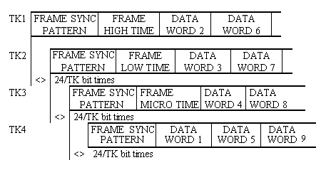 . 8.7.3.4 The word structure shall be identical to that described in paragraph 8.4. 8.7.3.5 The frame length shall be fixed and shall be the same for each track used for a given bus. The frame length shall conform to the requirements of subparagraph 8.6.5. 8.7.3.6 The data shall be formatted such that it is transmitted (recorded) most significant bit first. 8.7.3.7 A structure employing frame time is recommended but optional. This subparagraph describes a four-track spread example using frame time. The PCM stream designated TK1 shall be constructed as the frame synchronization word, followed by the high order frame time word, followed by data words (see figure 8-4). The PCM stream designated TK2 shall be constructed as the frame synchronization word, followed by the low order frame time word, followed by data words. The PCM stream designated TK3 shall be constructed as the frame synchronization word, followed by the microsecond frame time word, followed by data words. The PCM stream designated TK4 shall be constructed as the frame synchronization word, followed by the first data word, followed by other data words. Schemes using one, two, or three tracks for a given bus shall follow like construction; that is, sequencing through the data track by track. If frame time is not used, data words shall immediately follow the frame synchronization patterns. ![]() |