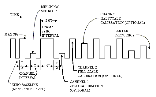 ![]() 2.1.2 In-Flight Calibration . It is recommended that in-flight calibration be used and channels 1 and 2, immediately following the frame synchroniza-tion interval, be used for zero and full-scale calibration. For RZ-PAM, channel 3 may be used for an optional half-scale calibration, and for NRZ-PAM, the channel interval preceding channel 1 may be used for half-scale calibration if set to 50 percent. 2.1.3 Frame Synchronization Interval . Each frame is identified by the presence within it of a synchronization interval. 2.1.3.1 Fifty Percent Duty Cycle (RZ-PAM) . The synchronization pattern interval shall have a duration equal to two information channel intervals (2T) and shall be full-scale amplitude for 1.5T followed by the reference level or zero baseline for 0.5T (see figure K-1). 2.1.3.2 One Hundred Percent Duty Cycle (NRZ-PAM). The synchronization pattern is in the order given: zero level for a period of T, full-scale amplitude for a period of 3T, and a level not exceeding 50-percent full-scale amplitude for a period T (see figure K-2). 2.1.4 Maximum Pulse Rate. The maximum pulse rate should not be greater than that permitted by the following subparagraphs. 2.1.4.1 PAM/FM/FM. The reciprocal of the shortest interval between transitions in the PAM pulse train shall not be greater than one-fifth of the total (peak-to-peak) deviation specified in chapter 3 and tables 3-1 and 3-2 for the FM subcarrier selected. 2.1.4.2 PAM/FM. The reciprocal of the shortest interval between transitions in the PAM pulse train shall be limited by whichever is the narrower of the following: 2.1.4.2.1 One-half of the 3 dB frequency of the premodulation filter when employed. 2.1.4.2.2 One-fifth of the intermediate frequency (IF) bandwidth (3 dB points) selected from the IF bandwidths which are listed in table 2-1. 2.2 Frame and Pulse Rate. The frame and pulse parameters listed below may be used in any combination: