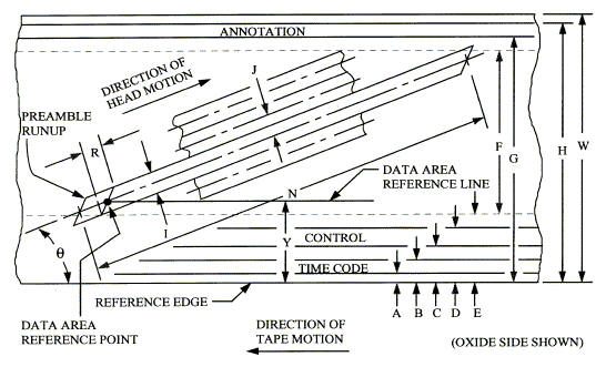 6.12 Preamble Recording for Automatic or Manual Recorder Alignment 6.12.1 Alignment, Direct Electronics 6.12.2 Alignment, FM Electronics A preamble (or postamble) may be recorded on the same tape as the data signal with known frequency and amplitude elements which will allow automatic or manual alignment of the signal electronics to optimize the performance of the playback system. Reproduce azimuth, equalization, and FM demodulator sensitivity may be adjusted at all available tape speeds. The preamble may be used for manual adjustment of any instrumentation magnetic tape recorder/reproducer (wide band and double density). Automatic adjustment requires a recorder/reproducer specifically designed with the capability to automatically adjust one or more of the following: reproduce-head azimuth, amplitude equalization, phase equalization, and FM demodulator sensitivity. The signal source may be internal to the recorder or may be externally generated. 6.12.1 Alignment, Direct Electronics. Direct electronics shall use a 1/11 band edge square wave for both manual and automatic alignment as given in appendix D. 6.12.2 Alignment, FM Electronics. The FM electronics shall use a 1/11 band edge square wave and ±1.414 Vdc or 0.05 Hz square wave for both manual and automatic alignment as given in appendix D. 6.13 19-mm Digital Cassette Helical Scan Recording Standards 6.13.1 Track Format 6.13.2 Tape and Cassettes 6.13.3 Recorder/Reproducer Input and Output These standards are for single-channel high-bit rate helical scan digital recorders using 19 mm tape cassettes. Bit rates of less than 10 megabits per second to 256 megabits per second or greater may be recorded and reproduced by equipment conforming to these standards. Interchange parties must, however, determine the availability at a particular site of the equipment required to meet particular data recording requirements. Compatibility between the recording device and the expected playback equipment must also be considered. 6.13.1 Track Format. The format recorded and reproduced by these systems shall be as specified in American National Standard For Information Systems 19-mm Type ID-1 Recorded Instrumentation Digital Tape Format, ANSI X3.175-19902 . Helical tracks employ azimuth recording wherein the head gap angle with respect to the recorded track center line is 90° + 15° for one scan and 90° - 15° for the adjacent scan. (See subparagraph 4.9.2 of standard X3.175-1990). Figure 6-6 and table 6-10 show details of the helical tracks and auxiliary longitudinal tracks for control, timing, and annotation in the ID-1 format. 6.13.2 Tape and Cassettes. Magnetic tape and 19-mm cassettes are specified in chapter 7. The magnetic tape shall meet the requirements for 850 oersted class (68,000 A/M). A tape base thickness of 16 um is normally employed. The recorder/reproducers shall be capable of using 19-mm cassettes that conform to the physical dimensions of medium and large cassettes as shown in table 6-11. Table 6-11 shows tape capacities and indicates the amount of time available for recording, assuming a data input rate of 240 megabits per second. 6.13.3 Recorder/Reproducer Input and Output. Data input and clock are required. The data input shall be in an 8-bit parallel, byte serial format, and the clock signal will be at the required byte rate. Data output will also be in 8-bit parallel format. ![]()